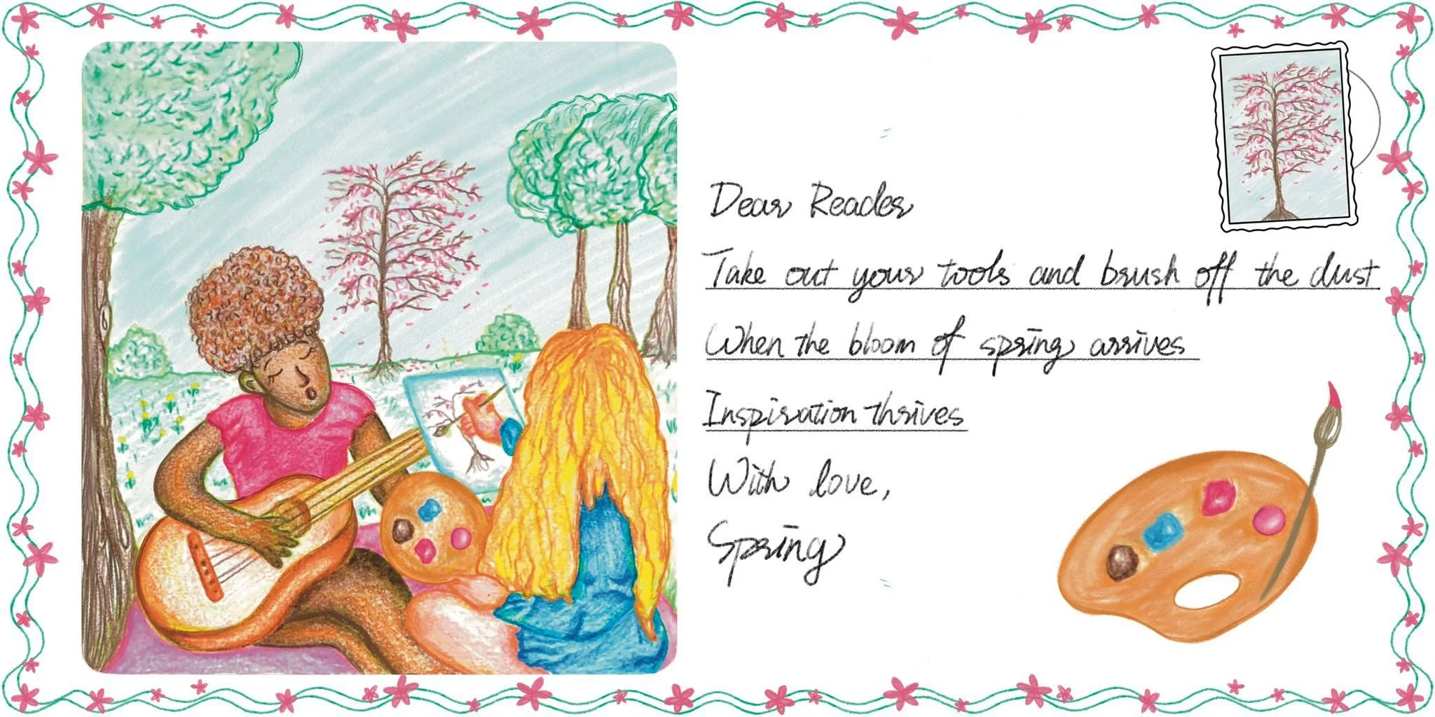 Our team’s response personified Spring as a cheerful friend that sends the reader postcards with handwritten poems. Each billboard is a postcard that highlights a different activity that promotes connection with Spring.